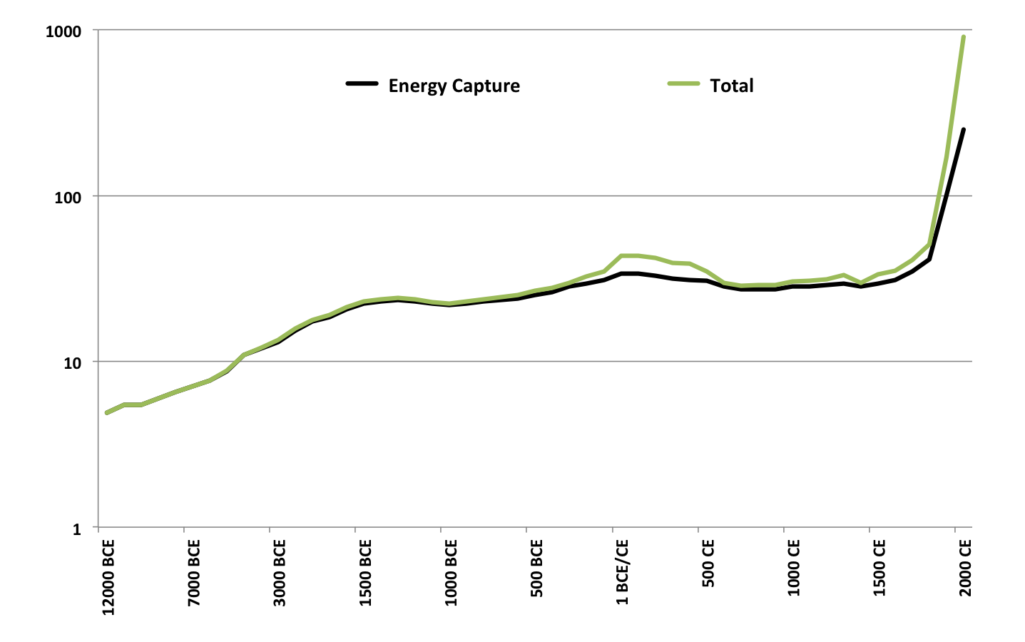 Morris’s social development index comprises four components: energy capture, organisation, war-making, and information technology. Each of them has its own relevance, but energy capture clearly stands out as the first among equals for two reasons: energy capture starts out as a biological requirement for survival, as such it goes back to even pre-human history. And because it begins as a biological need, it forms the foundation for all human activity, including the other three components of the index. It directly relates human activity to the physical world of available resources, so you might view energy capture as an indicator for the potential constraints to social development. Think of it as the physical constraint to cultural evolution.