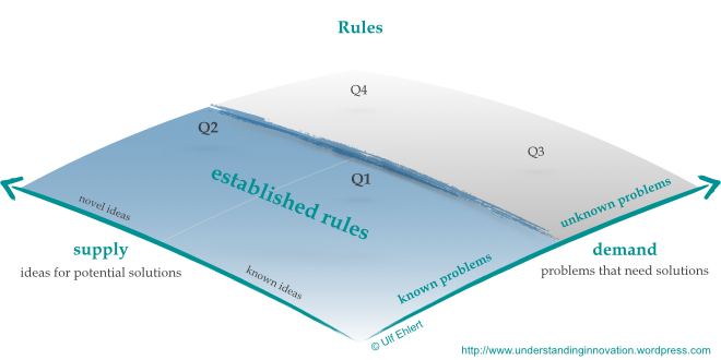 That is the case in the first quadrant (business as usual) as much as for the second quadrant (research), even though the respective institutions are quite different: innovation in Q1 is guided by those institutions that shape the business environment (including managing a company as well as the engagement of the company with the market, with customers and competitors), while innovation in Q2 will respond to institutions that are related to research, such as for example higher education or the scientific method.