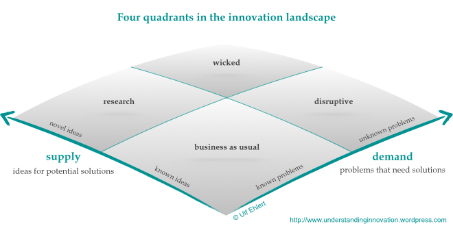 The innovation landscape is shaped along two axes: problems that demand for a solution, and ideas for potential solutions. Within that landscape, we then find four different quadrant: disruptive, research, business as usual, and wicked. The decentralisation of resource flows has different effects on each of them. So what are the changes and challenges, and what remains unchanged?