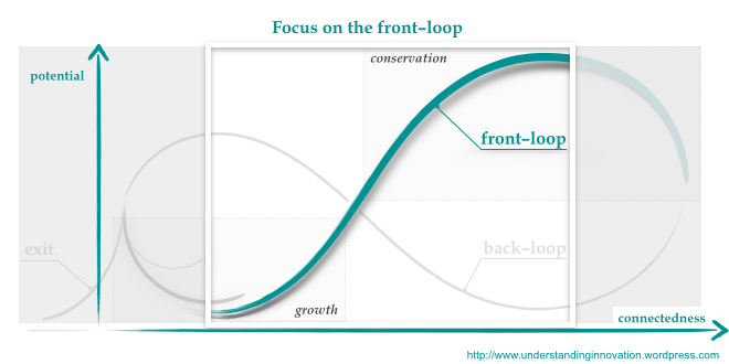 Optimists will naturaly focus their attention on the front–loop of the adaptive cycle, and for obvious reasons: the front–loop is the portion of the cycle that everybody has made the most experience in; it evolves gradually, slowly, incrementally; it “behaves” predictably; most importantly, this is a period of growth, of productivity. Hence it is not surprising that everybody would like the front–loop with all its positive connotations to continue forever. That selective view of the adaptive cycle is sketched above; it considers only the phase of rapid growth and the beginning of the conservation, when potential is still increasing.