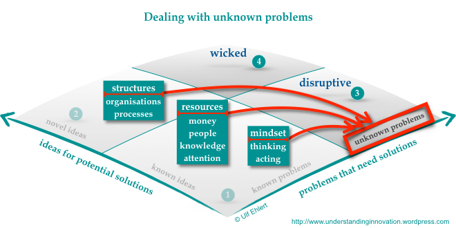 All of that makes us vulnerable to unknown problems, which could be either truly novel, like the famous Black Swans, or not (yet) fully understood, such as climate change. These types of problems shape “the tricky half” of the innovation landscape sketched below. They are characteristic for the disruptive and wicked quadrants, which seem to overwhelm us with their speed, complexity, and unexpected twists and turns. They often take us by surprise and leave us in shock, with that distinct feeling of being hit totally unprepared. How can we deal with these types of problems? How could we escape that bubble of the known problems?