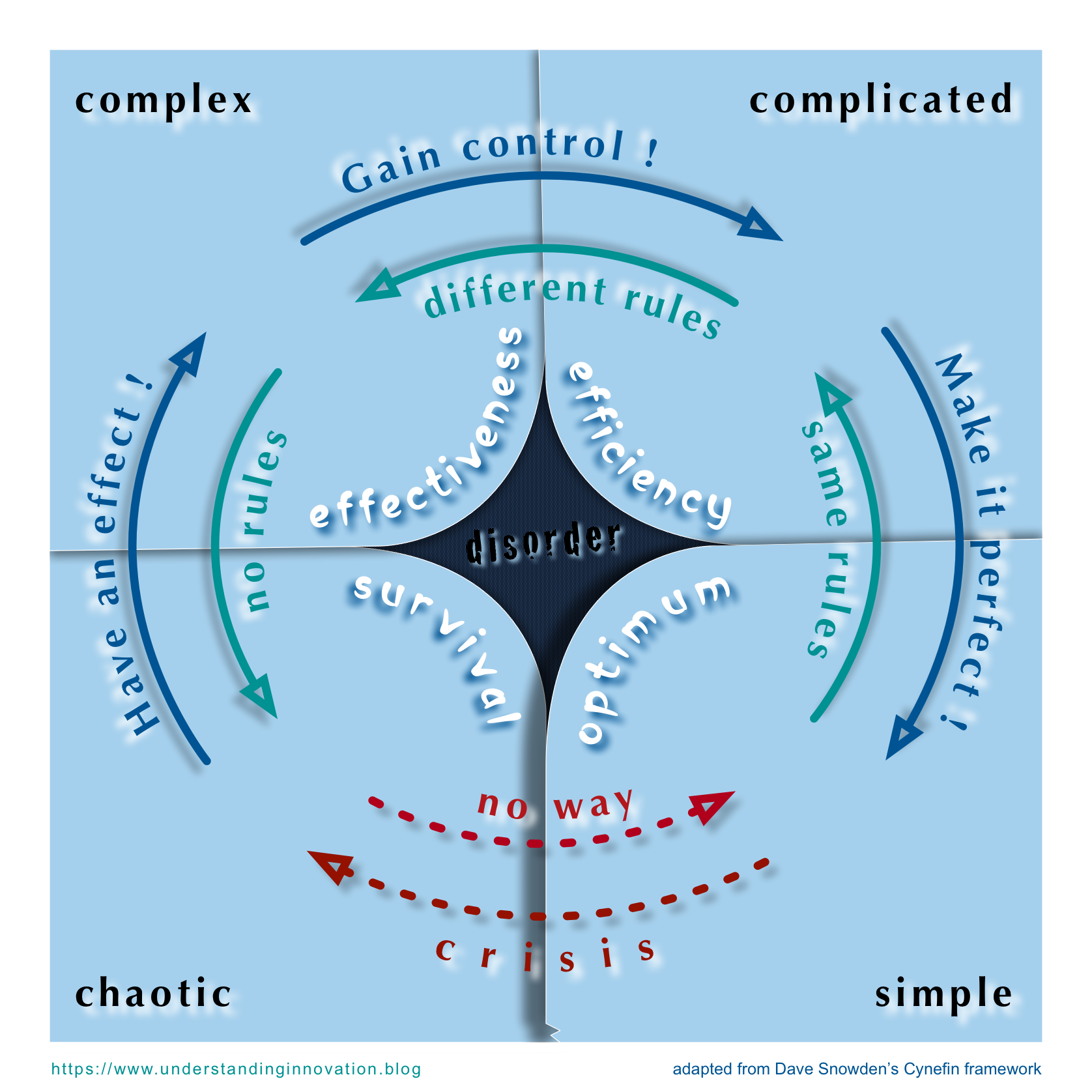 In each the domains, you’ll have to pursue a different objective. In the chaotic domain, your primary goal is survival, paired with the ambition to get to a less life-threatening place like for example the complex domain. If you are in the complex domain, you strive for effectiveness, for causing a desired change. In the complicated domain, your focus is on efficiency, on structures and processes that increase your productivity. When your are the simple domain, you go for the optimum, for the perfect solution. But mind the domain of disorder, of not knowing where you are, of misjudging your situation. You’d enter this domain unknowingly and at immense risk of catastrophic failure; hence the only objective is to understand where you really are and then act accordingly.