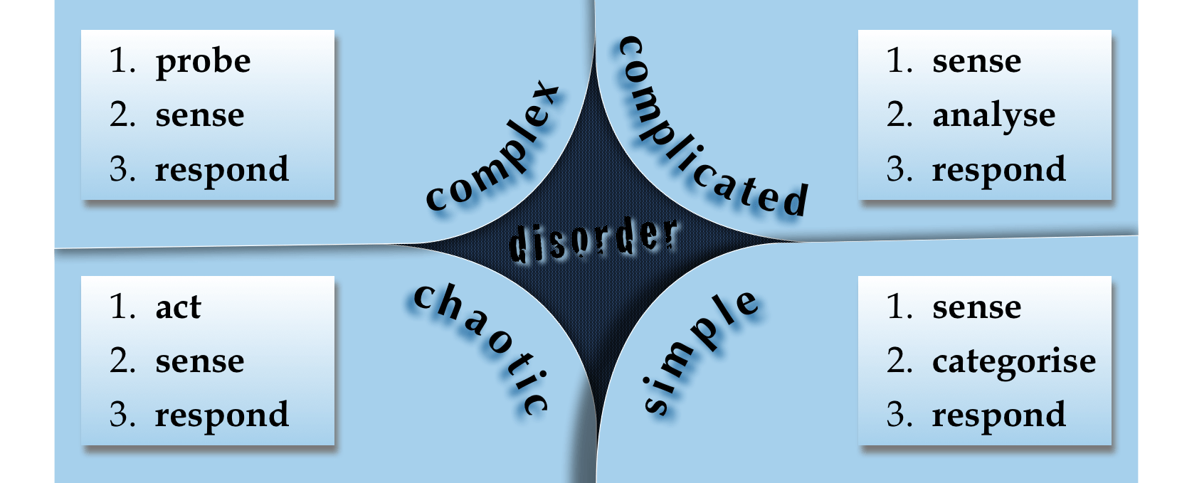 With the Cynefin framework, Dave Snowden developed a generic tool to support decision-making and problem-solving. Looking at the characteristics of situations (demanding a decision) or problems (in need of a solution), he identified five domains: simple, complicated, complex, chaotic, and disorder.