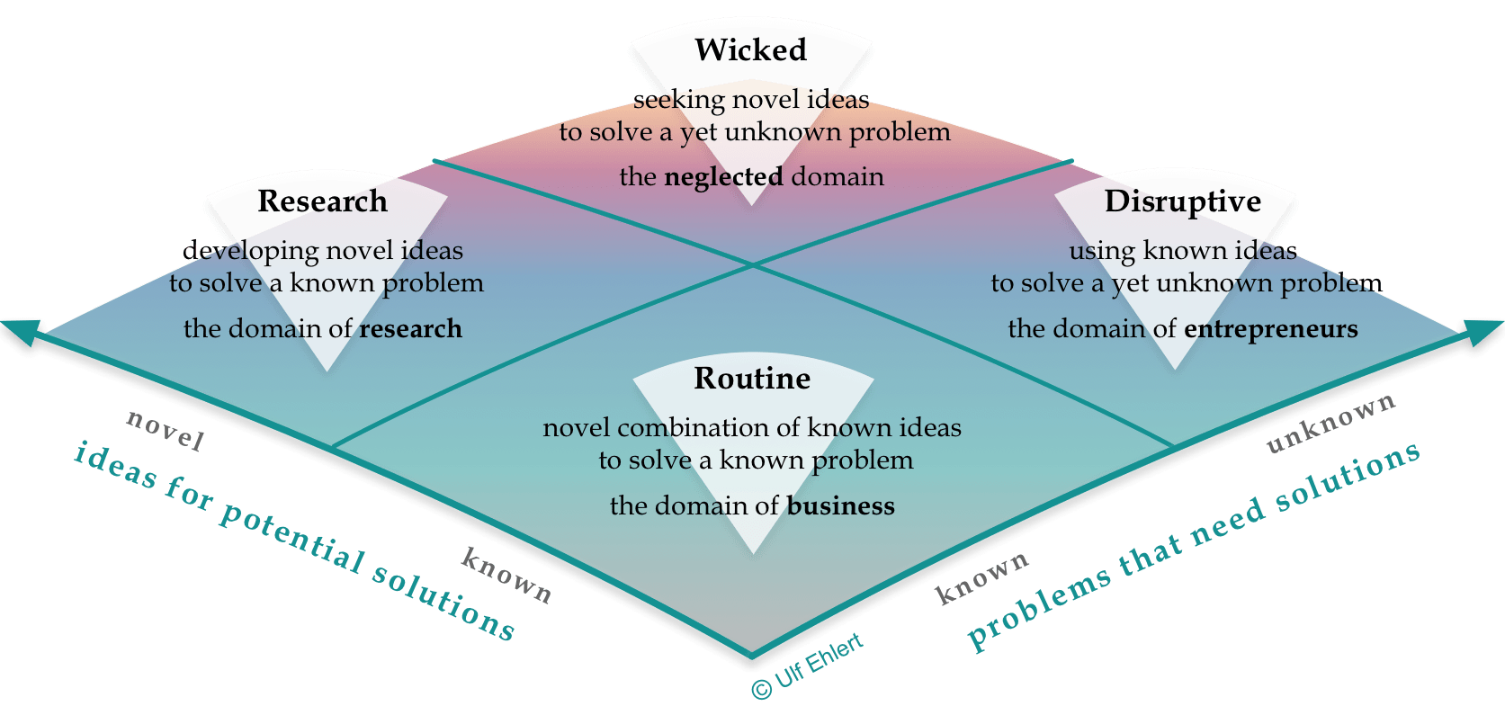 You’ll meet the extreme opposite in the wicked quadrant of the innovation landscape. There, innovation seeks to find novel ideas to solve yet unknown problems (see inset). With no sufficient knowledge of the problem space or the solution space, novelty is all over. For this type of often neglected innovation, there’s no routine: it’s all uncharted territory. This is the realm of public goods like global health care or the fight against climate change. This is the realm of market failures as no viable business models are known, yet. Hence, for the time being, the corporate world acts as free rider, waiting for societal investments to chart a viable path.