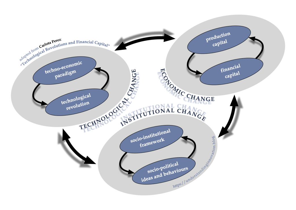 Each of these spheres follows its own rhythm, with its own specific inertia. For example, economic change (due the agility of financial capital) will respond to some technological revolution a lot faster than institutional change. And that’s the other key characteristic of Perez’ perspective: each of the spheres drives change in the other spheres, as much as it is driven by their changes. The result defies any simplistic attempt at identifying the one prime mover. Instead, Perez advocates a truly holistic approach that is looking for the complex interactions between many actors, many processes, many drivers.