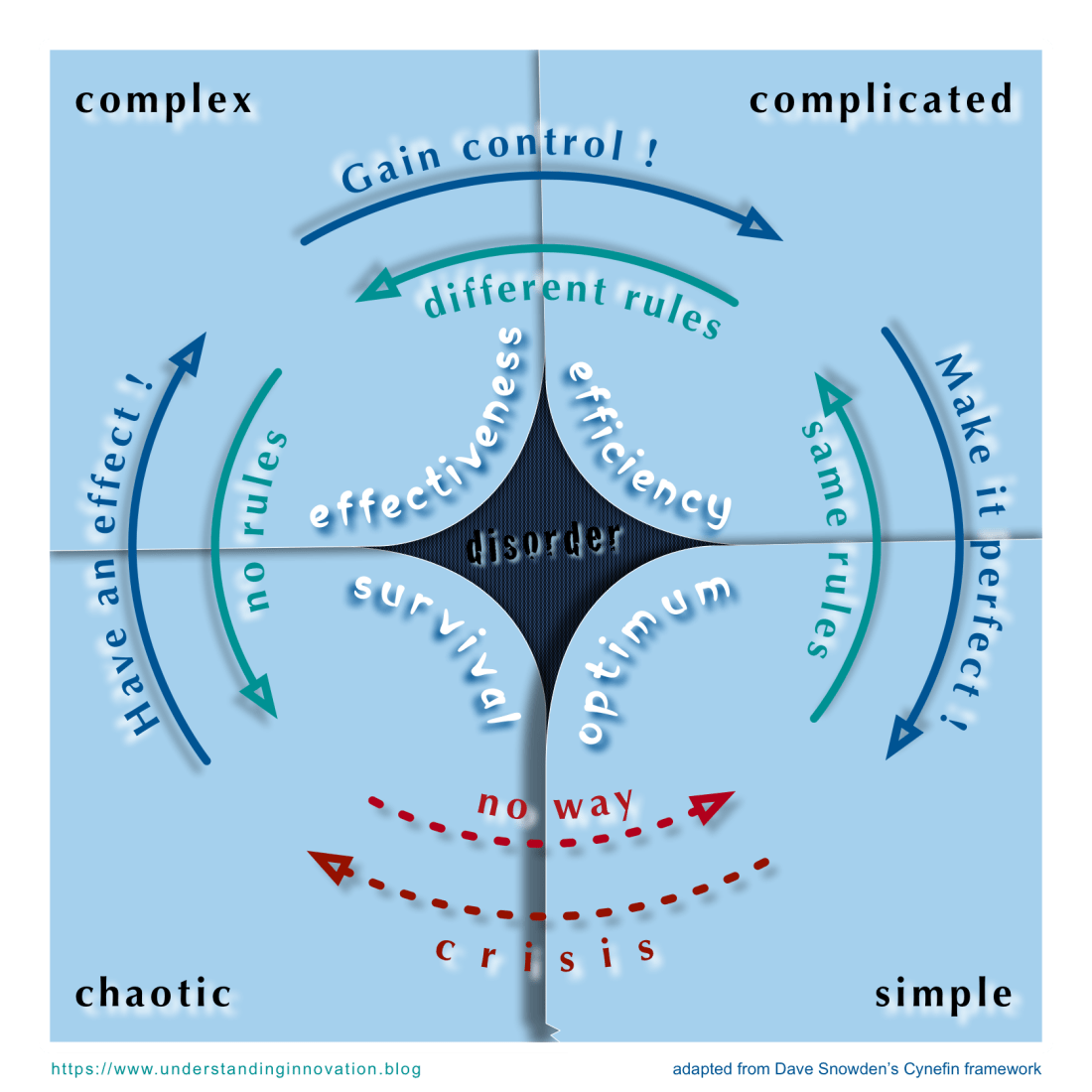 Over the past few weeks, I introduced you to a sense-making model developed by Dave Snowden. His Cynefin framework can serve as a map to give you some orientation in challenging situations of decision-making or problem-solving. Today, let's take a closer look at how you can read this map, and why it's advisable to avoid the South.