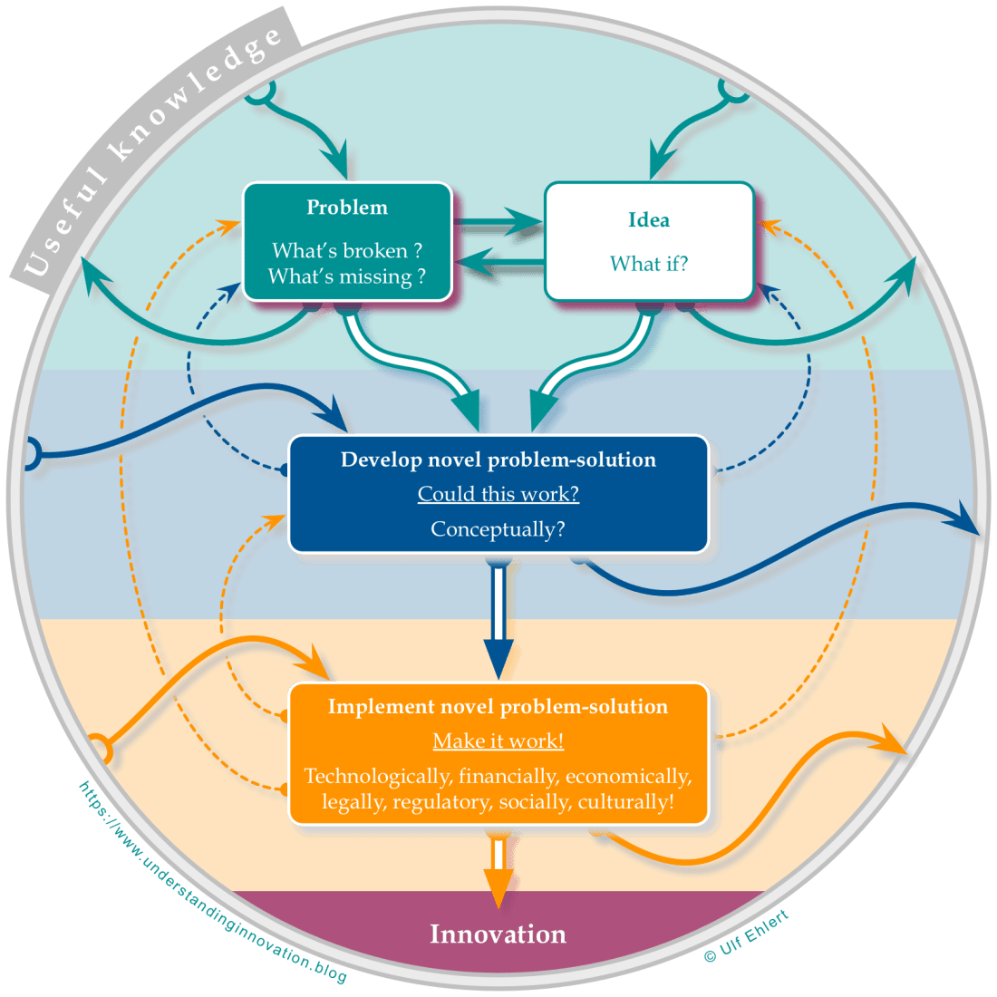 In the previous post, I introduced a graphical overview of innovation's inner workings, embedded in a circle of useful knowledge that innovation draws from, and contributes to. That chart might create an impression of innovation as a messy, even unwieldy process. To highlight the structure underneath, today I'll dissect it a little further. A simplified storyline of … Continue reading More sketches of an innovation