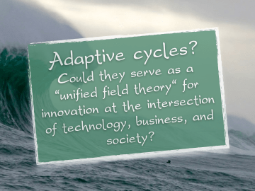 What is it that adaptive cycles could tell us about innovation? Which new perspective could they give us? Could they actually serve as a common backdrop, a "unifying field theory" that covers all dimensions of innovation? That could incorporate the relevant aspects of technology, business, and society? I'm curious to learn more about the ups and … Continue reading Adaptive cycles and innovation – first contact